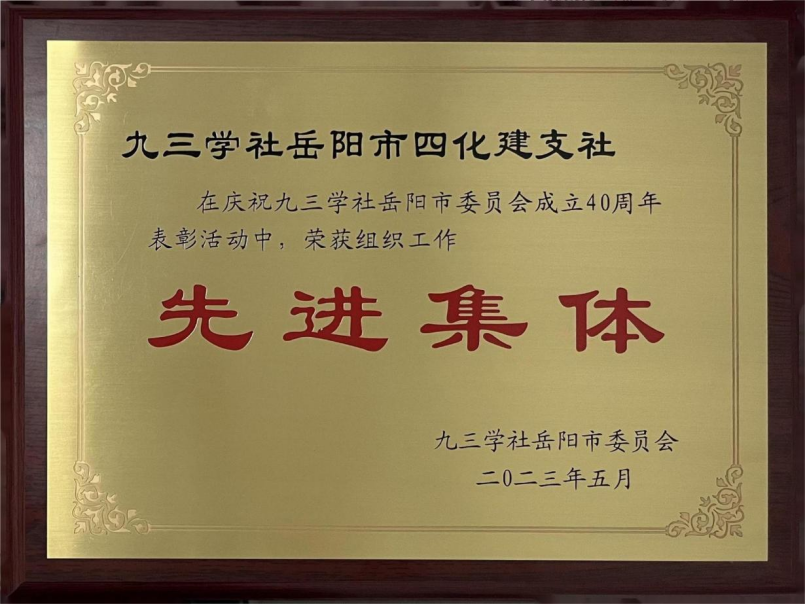 5月29日,在慶祝九三學社岳陽市委員會成立40周年表彰活動中,九三學社四化建支社獲評組織工作先進集體。