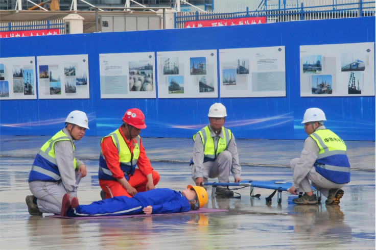 此次應急演練模擬在延化化工公司6080項目尿素主框架施工現場,一名作業人員在高處作業過程中,因腳手架踏板未固定,安全帶系掛不牢,不慎從三層作業處墜落受傷。安全員發現險情后,迅速啟動應急救援預案,由現場30余人組成的通訊聯絡、搶險救援、醫療救護、技術調查、警戒保衛、物資支持等六個小組分工合作,及時搶救傷員并對墜落區域進行疏散隔離,整個演練過程井然有序,突發事故得到了妥善處理。