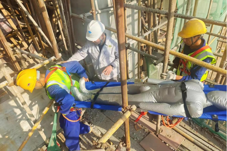 演練過程中,參演人員劃分為收集組、保障組、警戒組、聯絡組、搶救組,通過模擬突發“高處墜落”事故,項目部迅速啟動應急救援預案,快速、高效、有序實施救援工作,最大程度降低事故損失,有效減少人員傷亡和財產損失,維護施工人員生命安全。