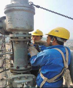 塔頂管道復位完成后,管道即可進入全面試壓階段。從而保證整個項目的中交的如期進行。 (圖為施工人員正在C-201塔頂安裝安全閥)