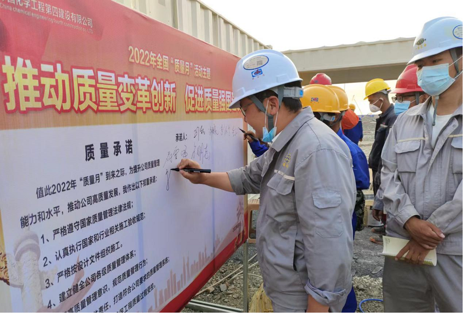 9月5日,華北公司凱賽項目部舉行2022年“質量月”活動啟動儀式。儀式上,安排部署了質量月活動具體落實措施。會上要求,嚴格按照活動方案組織開展各項工作,營造人人關心質量、人人重視質量、人人提升質量的濃厚氛圍,讓重視質量、共管質量成為工作常態。加強對施工重點環節的質量管理檢查和控制,嚴把各階段質量關口,切實提高工程實體質量,努力打造“化建湘軍”央企品牌。現場全體人員在宣傳牌上簽名,共同作出堅守質量底線、鑄造精品工程、助推企業高質量發展的莊嚴承諾。(通訊員  萬江博  尹文煜)
