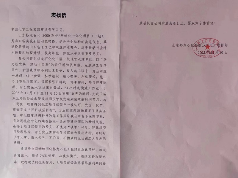 表揚信中對項目部的施工進度、質量和頑強拼搏的作風給予了充分肯定。信中指出,項目部自投入施工以來,科學組織、精心部署、嚴格管控,施工各環節層層落實。特別是11月1日至11月10日利用10天時間,完成了裕龍三路兩處海水管線箱涵從管線安裝到回填的時間節點,安全、優質、高效完成了項目“百日攻堅目標”,展現了四化建公司良好的團隊精神風貌,不愧“鐵軍”稱號。