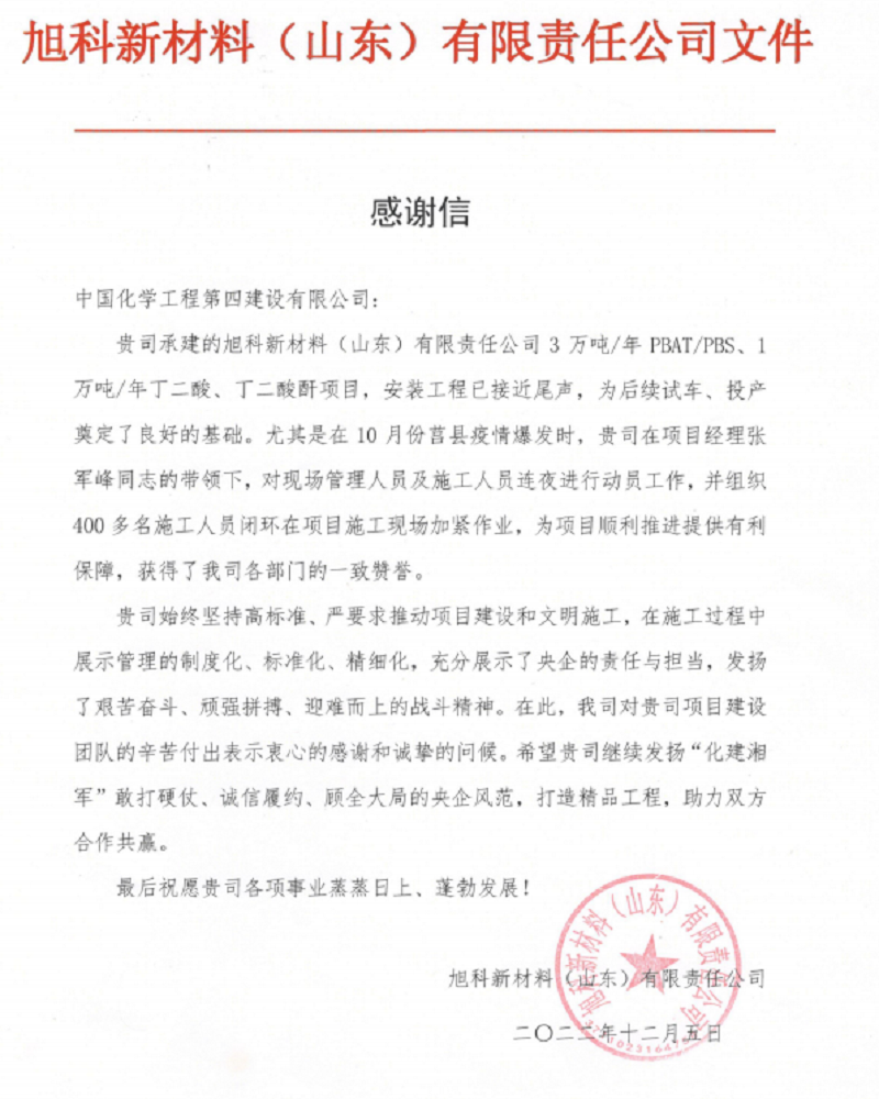 近日,公司收到旭科新材料(山東)有限責任公司發來感謝信,信中對華北公司克服疫情影響、施工條件困難、工期緊張等不利因素,如期完成旭科項目開車節點所付出的辛勤努力表示感謝。
