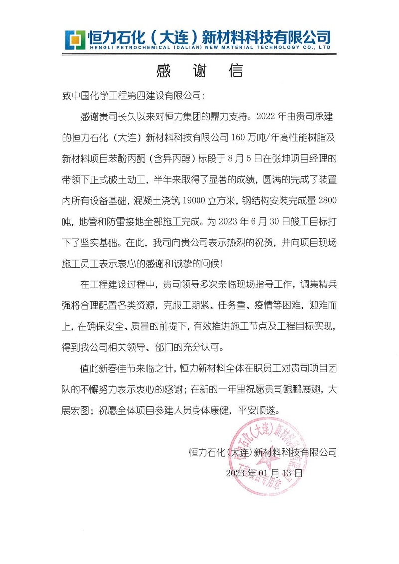 近日,東北公司收到恒力石化(大連)新材料科技有限公司發來的感謝信,對東北公司承建的苯酚丙酮裝置工作給予高度肯定,并對項目現場施工員工的辛勤付出表示感謝。