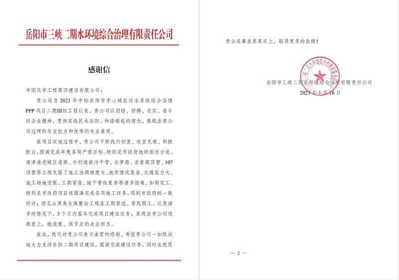 1月16日,岳陽市中心城區污水系統綜合治理項目部收到岳陽市三峽二期水環境綜合治理有限責任公司發來的感謝信。