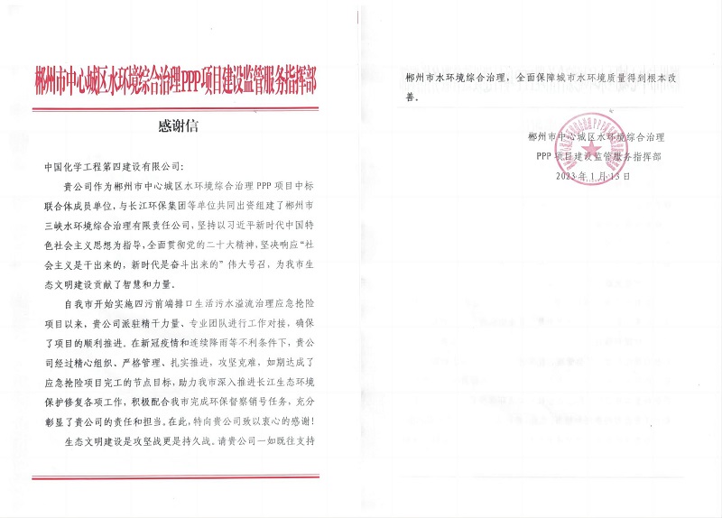 新年伊始,公司郴州項目部收到郴州市中心城區水環境綜合治理PPP項目建設監管服務指揮部發來感謝信。