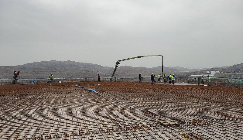 該后處理裝置高40米、寬42米,是聚甲醛項(xiàng)目最高單體工程。面對(duì)施工現(xiàn)場天泵受高大跨度和場地限制、混凝土澆筑危險(xiǎn)因素多、施工難度大等不利因素,項(xiàng)目部積極與設(shè)計(jì)代表溝通,在樓頂進(jìn)行優(yōu)化組織施工,既保證施工安全又提高了施工效率。經(jīng)過項(xiàng)目施工人員日夜接續(xù)奮戰(zhàn),圓滿完成了此次封頂施工任務(wù)。