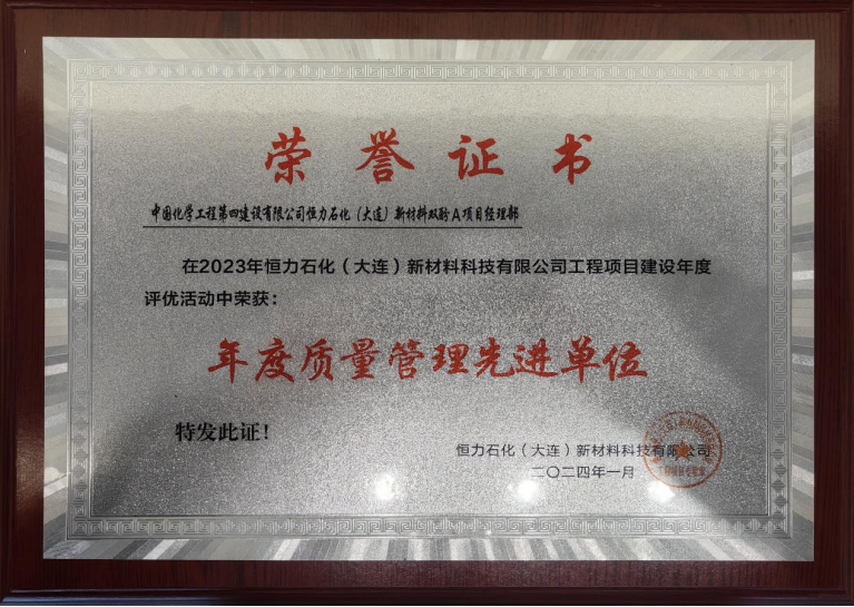 近日,華東公司恒力石化(大連)新材料雙酚A項目部獲得恒力石化(大連)新材料科技有限公司頒發的“年度質量管理先進單位”。