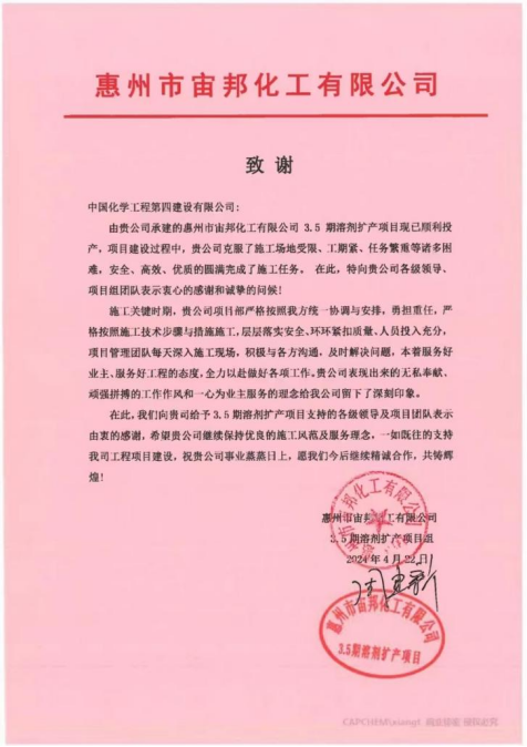 近日,公司收到惠州市宙邦化工有限公司發(fā)來的致謝信,信中對公司圓滿完成惠州市宙邦化工有限公司3.5期溶劑擴(kuò)產(chǎn)項目施工任務(wù)表示衷心感謝。
