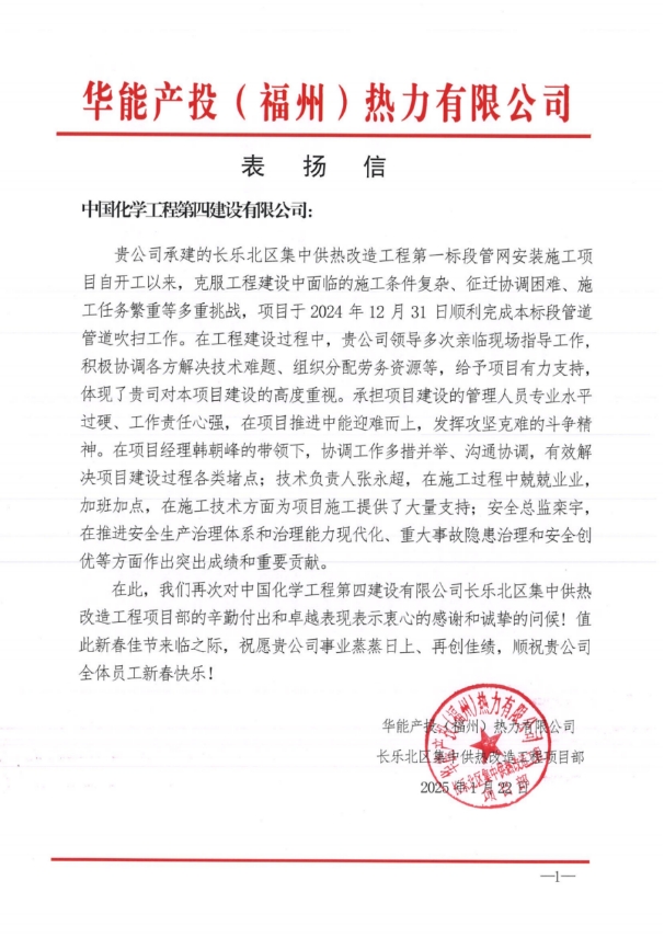 東北公司福州華能項(xiàng)目收到業(yè)主表揚(yáng)信