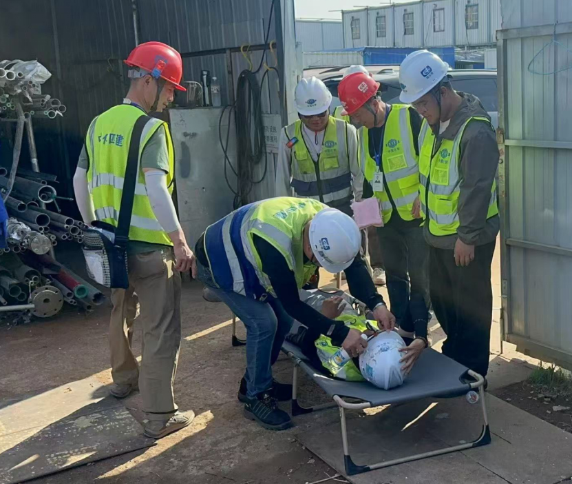 演練緊密貼合施工現場實際,模擬1名作業人員在登高作業時因安全帶使用不當發生墜落的突發場景。事故發生后,現場立即啟動應急預案,迅速組建醫療救治、資源保障、搶險救援、通訊聯絡、疏散避險、治安維護等6個專業小組。各小組協同配合完成從事故報警、應急響應到傷員轉運的全流程處置,演練過程銜接緊密、操作規范,充分展現項目團隊的應急反應能力。