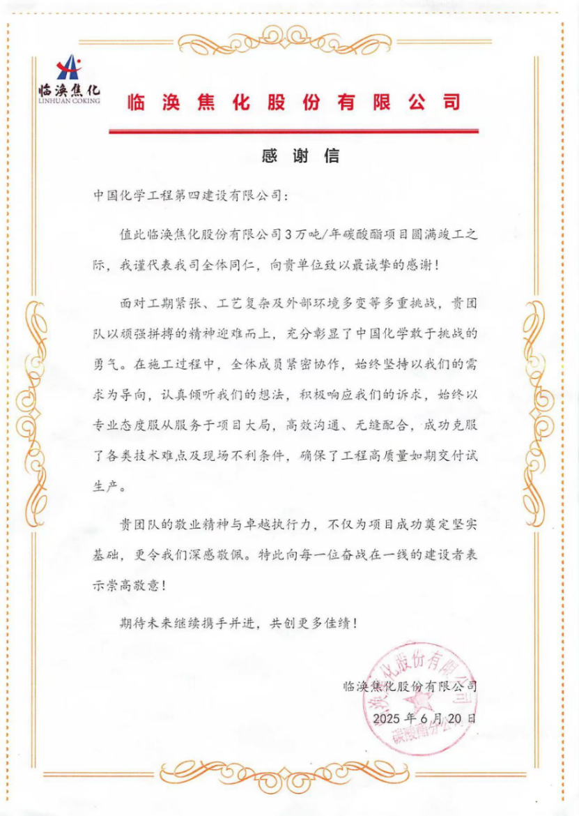 西部公司臨渙焦化碳酸酯項(xiàng)目部收到業(yè)主感謝信