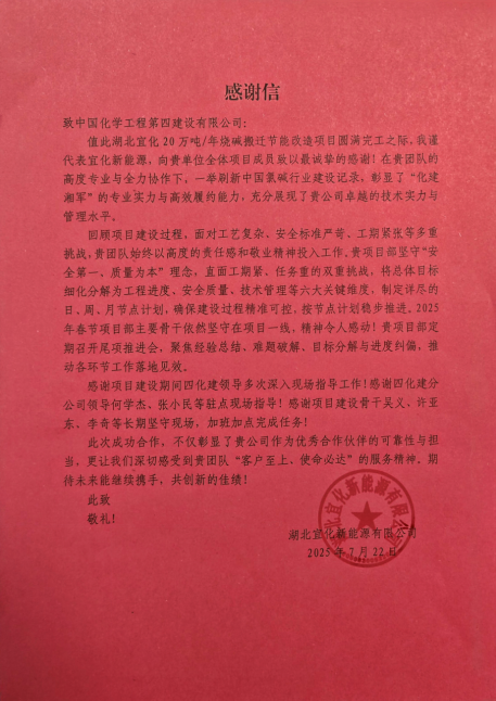 7月22日,中國化學四化建收到湖北宜化新能源有限公司發(fā)來的感謝信,信中對公司在湖北宜化20萬噸/年燒堿搬遷節(jié)能改造項目建設中的突出表現(xiàn)給予充分肯定和高度贊揚。