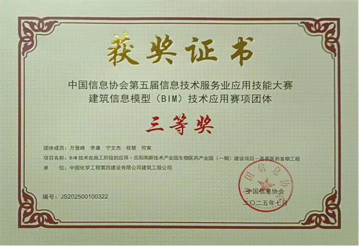 近日,在中國信息協(xié)會第五屆信息技術服務業(yè)應用技能大賽上,由建筑工程公司BIM技術小組成員萬登峰、李康、桂慧、寧文杰、何寅共同創(chuàng)作的參賽作品——《BIM技術在施工階段的應用:岳陽高新技術產業(yè)園生物醫(yī)藥產業(yè)園(一期)建設項目·晶易醫(yī)藥首期工程》,榮獲建筑信息模型(BIM)技術應用賽項團體三等獎。