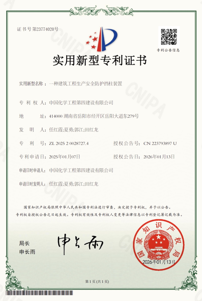 近日,從國家知識產權局傳來喜訊,由華北公司研發團隊自主研發的“建筑工程生產安全防護擋柱裝置”,成功獲得國家實用新型專利授權。這是華北公司立足施工一線需求,推動技術創新的又一具體成果。