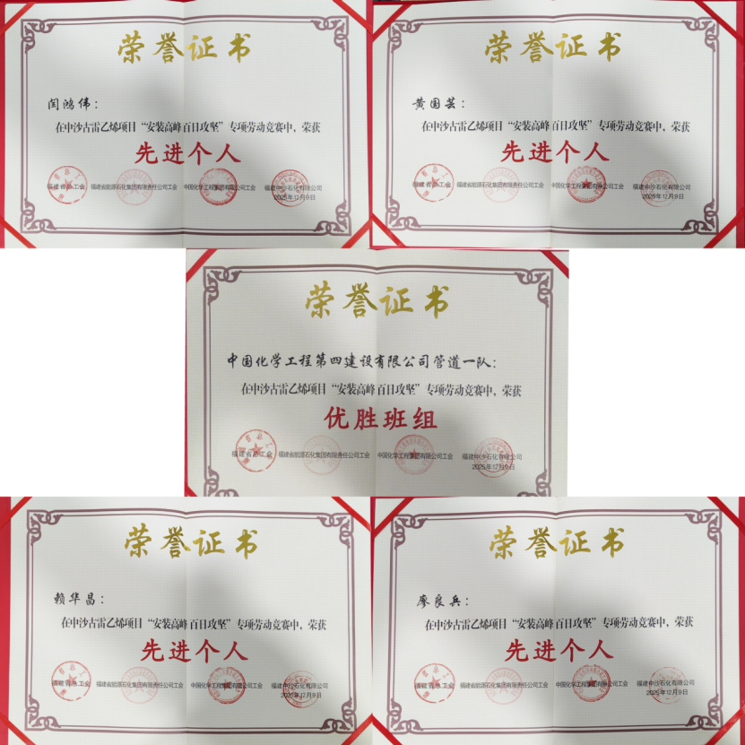 近日,在中沙古雷乙烯項(xiàng)目引領(lǐng)性勞動(dòng)競(jìng)賽2025年度總結(jié)暨創(chuàng)新成果交流活動(dòng)中,中國(guó)化學(xué)工程第四建設(shè)有限公司華南公司中沙古雷項(xiàng)目部管道一隊(duì)榮獲“優(yōu)勝班組”稱號(hào),黃國(guó)蕓、賴華昌、廖良兵、閆鴻偉等4名員工榮獲“先進(jìn)個(gè)人”稱號(hào)。