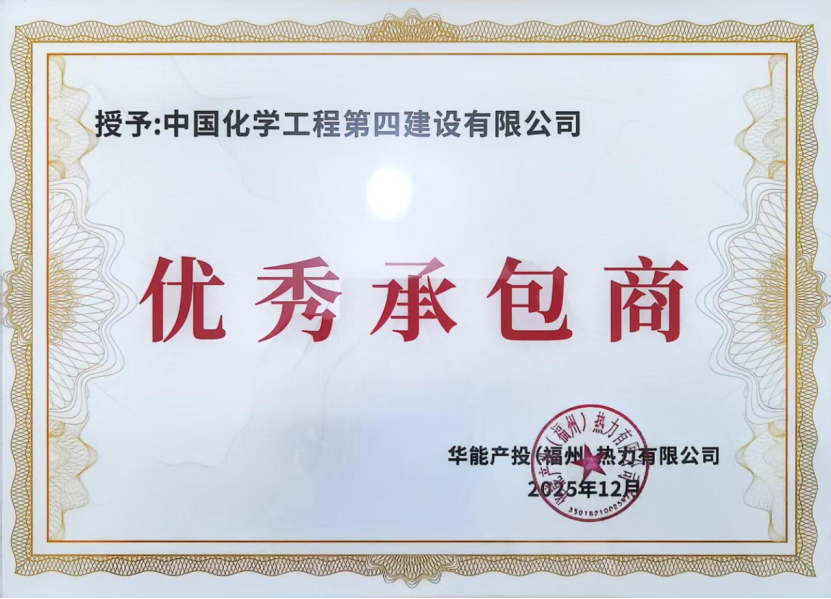 近日,中國化學工程第四建設有限公司被福州華能項目業主華能產投(福州)熱力有限公司授予“優秀承包商”榮譽稱號。該獎項是對公司在福州華能項目中高效履約能力、精湛施工品質與優質協作服務的認可。