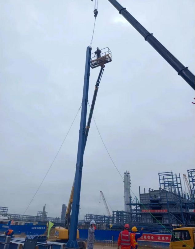 此次吊裝難度大,最大塔高度49米,穿衣戴帽后最大重量195噸。為組織好這兩臺塔器的吊裝工作,項目施工人員對設備吊裝過程的每一步“精打細算”,吊裝嚴格按照方案執行并進行技術交底。吊裝期間,項目主要管理人員堅守現場,對設備吊裝情況實時監督,直至塔器順利安裝就位。此次吊裝,獲得監理業主一致認可,為后續施工打下了堅實基礎。