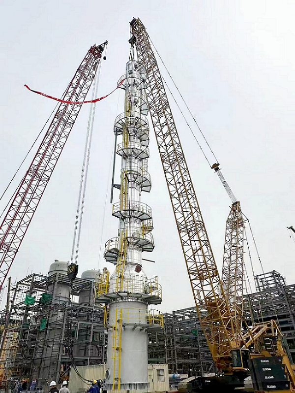 大連恒力項(xiàng)目苯酚丙酮裝置首臺(tái)穿衣戴帽塔器完成吊裝