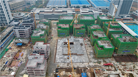 近日,由港晨公司承建的岳陽自貿片區數字經濟產業綜合體建設項目C4、C5、C10、C11棟共計4個單體實現主體結構封頂,C地塊多層建筑的主體結構已全面封頂,進入二次結構及砌體砌筑施工階段。