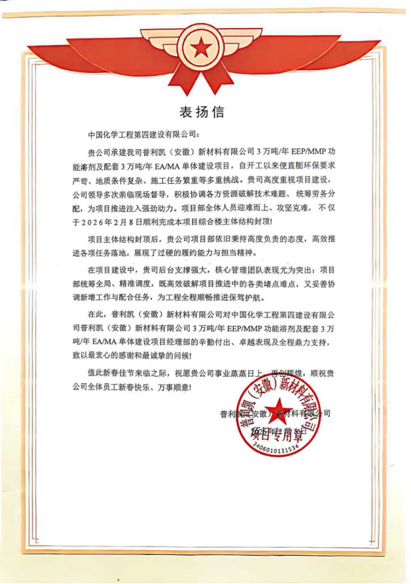 近日,由西部公司承建的普利凱(安徽)新材料有限公司3萬(wàn)噸/年EEP/MMP功能溶劑及配套3萬(wàn)噸/年EA/MA單體建設(shè)項(xiàng)目綜合樓主體結(jié)構(gòu)順利封頂,標(biāo)志著項(xiàng)目建設(shè)取得階段性勝利,正式轉(zhuǎn)入二次結(jié)構(gòu)及裝飾裝修施工階段。業(yè)主單位特發(fā)來(lái)表?yè)P(yáng)信,對(duì)項(xiàng)目團(tuán)隊(duì)的卓越表現(xiàn)給予高度評(píng)價(jià)。